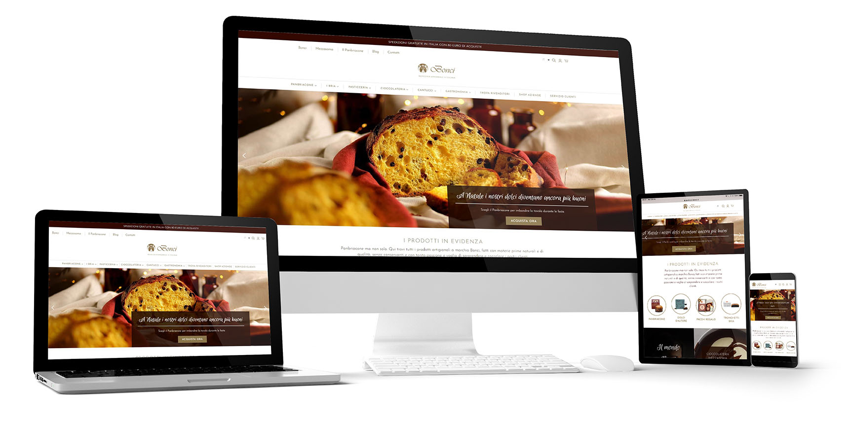 Bonci è una pasticceria artigianale toscana, nata nel 1953 e ancora oggi a conduzione famigliare. Il nostro prodotto di punta è il Panbriacone, che ci ha fatto conoscere in tutta Italia e anche all’estero per la sua qualità e bontà. Sentivamo da tempo l’esigenza di migliorare la nostra comunicazione, specie quella online. Volevamo che la nostra storia e la nostra identità di azienda famigliare emergesse e fosse valorizzata; inoltre, avevamo bisogno di migliorare l’usabilità delle nostre piattaforme, in primis il sito web con la sua area di e-commerce.